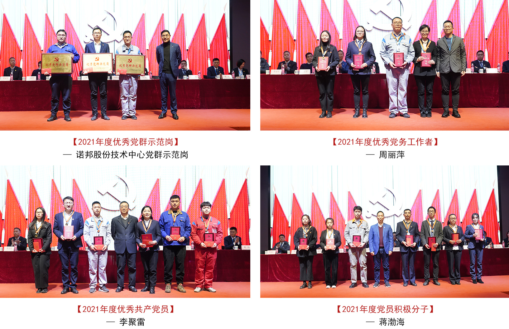 2021年度老板集团党委总结表彰暨党员干部大会顺利召开 2022-01-24 浏览量:{{count}} 战鼓声声逐梦行,不负韶华写新篇。1月24日下午,2021年度老板集团党委总结表彰暨党员干部大会在茅山503多功能报告厅召开,集团党委书记、董事长任建华出席大会并作重要讲话。集团各子公司科级以上干部、群团组织负责人受邀列席此次大会。 大会对2021年度党委先进集体和个人给予表彰,诺邦股份技术中心党群示范岗荣获“2021年度优秀党群示范岗”,周丽萍荣获“2021年度优秀党务工作者”,李聚雷荣获“2021年度优秀共产党员”,蒋渤海同志荣获“2021年度党员积极分子”。